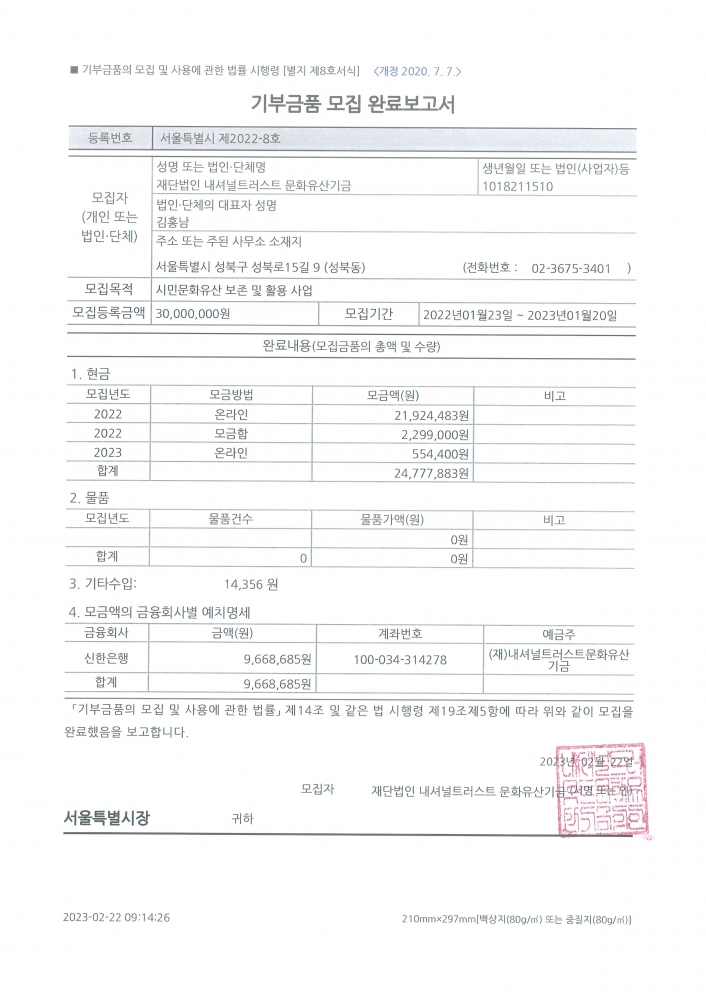 기부금품 모집 완료 보고서(2022-01-23~2023-01-20)