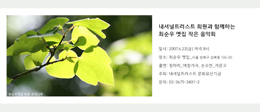 내셔널트러스트에서는 회원 여러분과의 만남과 회원 확대를 위해 최순우 옛집에서 초 여름밤 작은 음악회를 개최합니다.