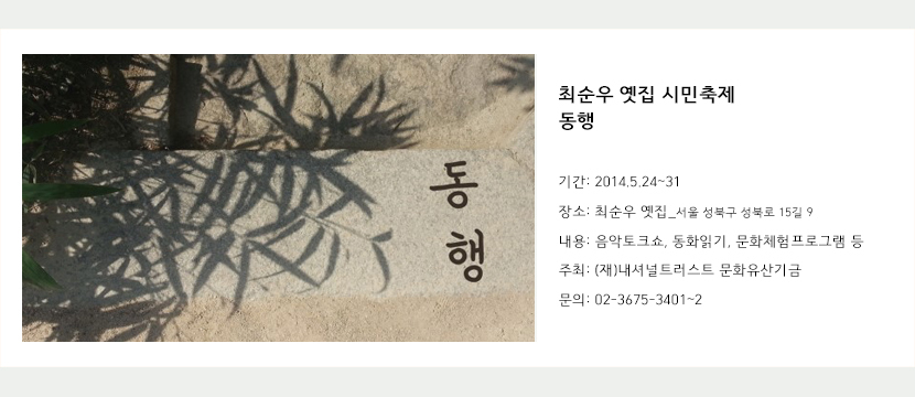 최순우 옛집이 문을 연지 10년을 맞이하는 올해는 ‘동행’을 주제로 한 전시와 음악토크쇼, 작은 음악회와 성북동 답사 등 다양한 문화체험프로그램이 마련되어 있습니다.