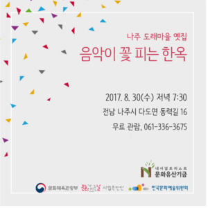 - 일시: 2017.8.30(수) 저녁 7시 30분 - 장소: 도래마을 옛집_나주시 다도면 동력길 16 * 당일 셔틀버스 운행(일정 추후공지) - 참가: 무료 참여 - 주최: 문화체육관광부 - 주관: 한국문화예술위원회, 문화가있는날사업 추진단, (재)내셔널트러스트 문화유산기금 - 출연: N뮤지크 - 문의: 061-336-3675, 02-3675-3401