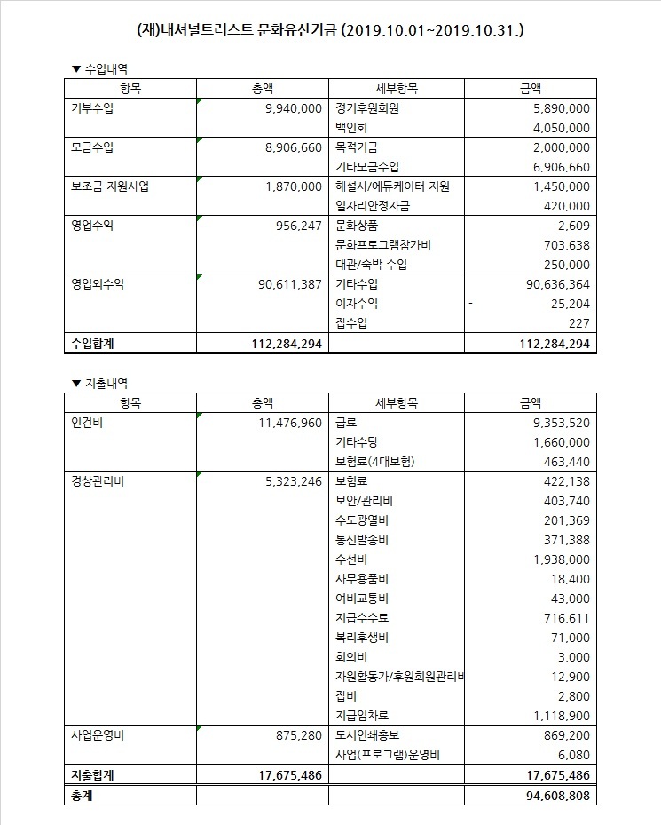 2019년 10월 수입지출명세서