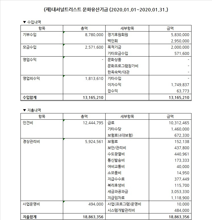 2020년 1월 수입지출명세서