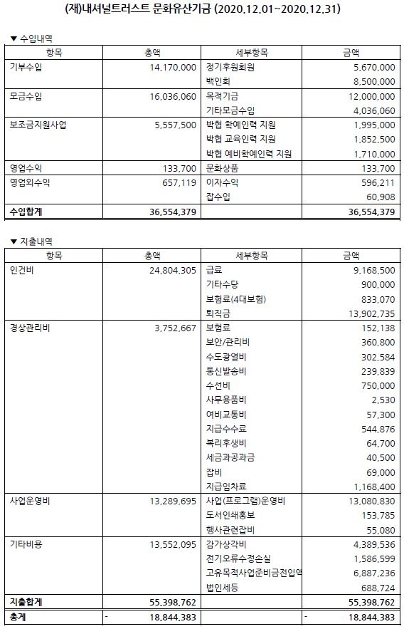 2020년 결산재무제표 / 연간 기부금 모금액 및 활용실적명세서