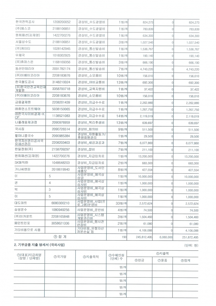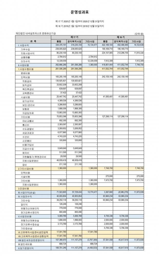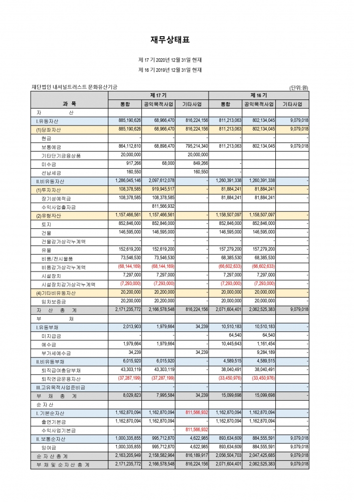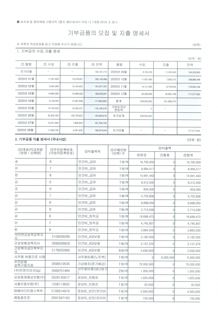 2020년 결산재무제표 / 연간 기부금 모금액 및 활용실적명세서