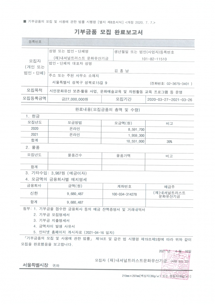 기부금품 모집 완료 보고서(2020-03-27~2021-03-26)