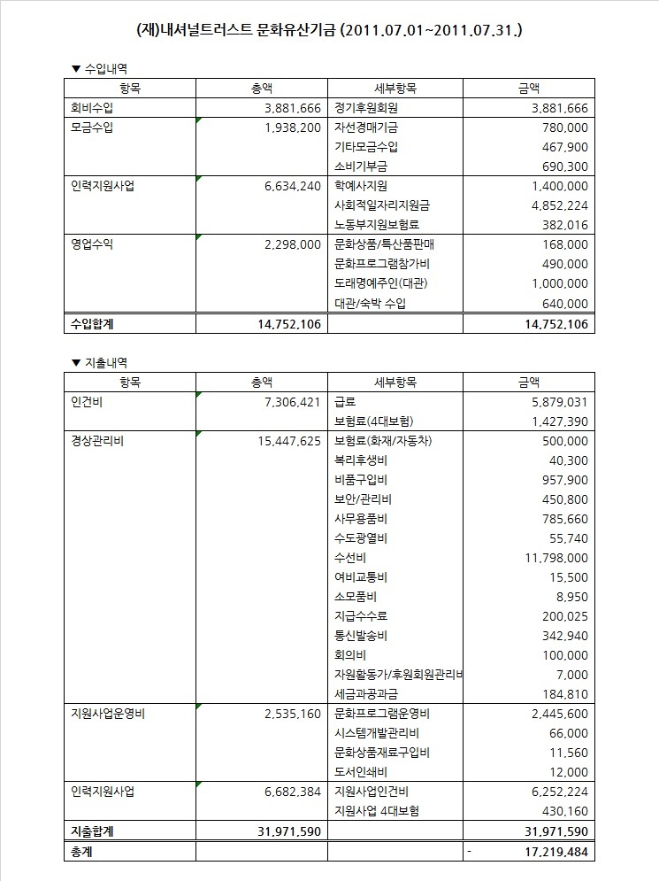 2011년 7월 수입지출명세서