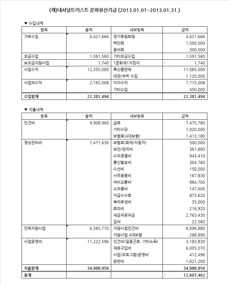 2013년 1월 수입지출명세서