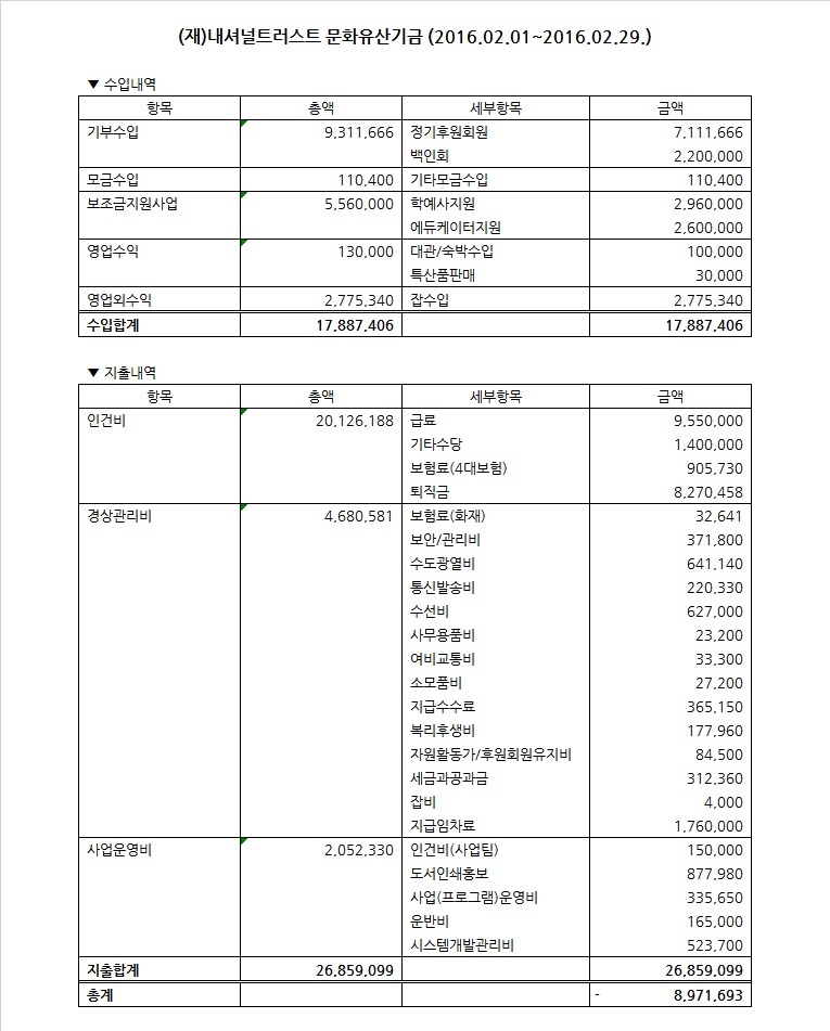 2016년 2월 수입지출명세서