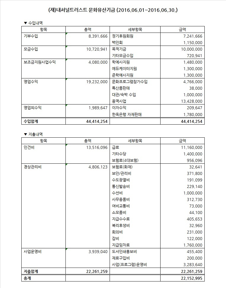 2016년 6월 수입지출명세서