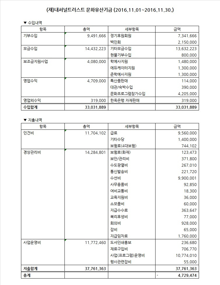2016년 11월 수입지출명세서