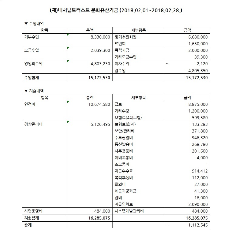 2018년 2월 수입지출명세서