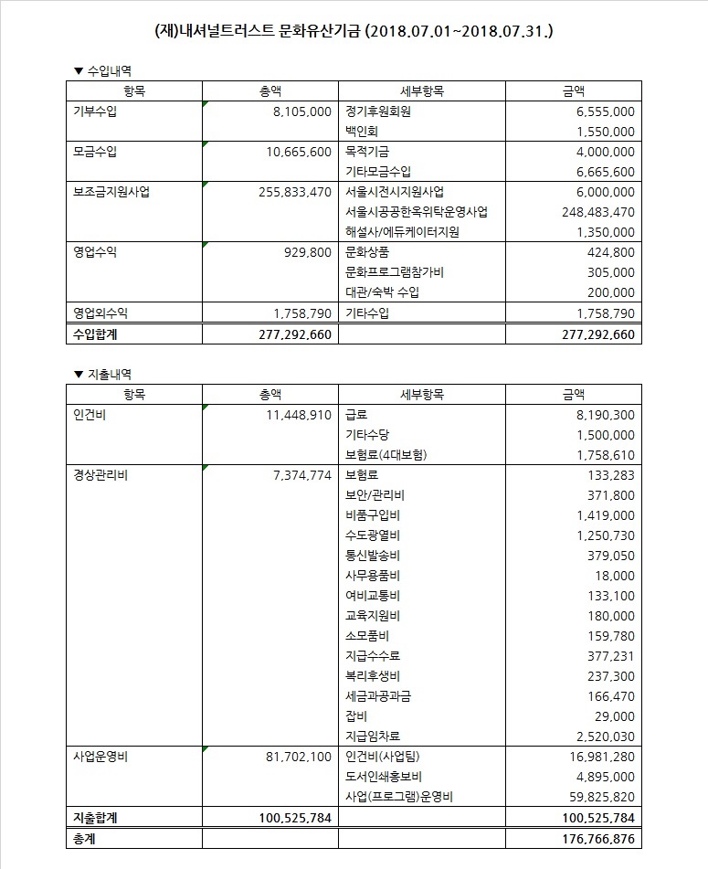 2018년 7월 수입지출명세서