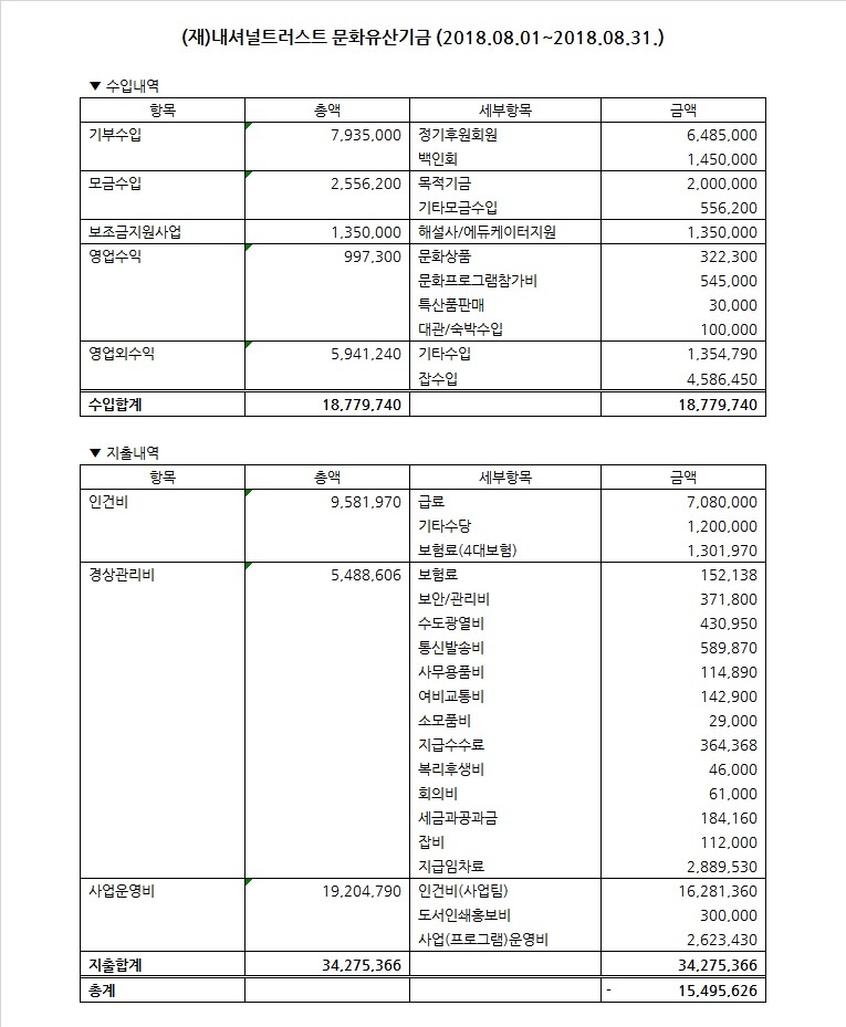 2018년 8월 수입지출명세서